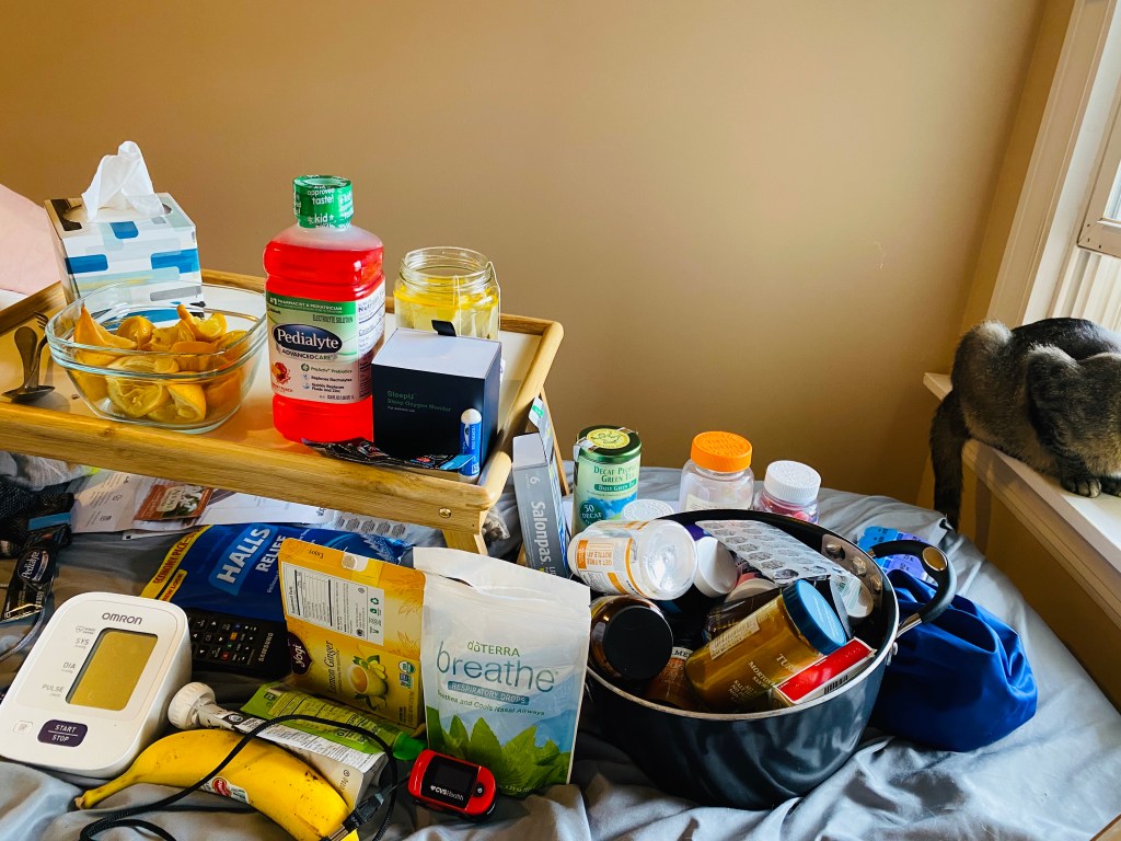 What else do I have here in my bed: -blood pressure monitor -pedialyte and coconut water, I drink 3 a day to keep my electrolytes up -lidocaine patches for my chest pain, which helps me breathe -icy hot which I rub on my ribs, chest and back at least 3x a day -“breathe” respiratory drops -vapor rub, I put on 4x per day -mucinex -benedryl -probiotics, I took 3 dif antibiotics so I need probiotics to get my good bacteria back -zinc lozenges -liposomal vitamin c and d -cranberry pills -milk thistle (to help w taking so many vitamins) -magnesium -oregano oil, to lower my blood pressure -black seed oil, for immunity and supports lung function -Ice pack -inhaler -acupuncturist herbs and tea -special pillow set so I can sit up and lay on my belly. Also, so I can put my legs up -compression socks to prevent blood clots -vibrating back massager I use on my lymph nodes a few times a day to cleanse them -Tylenol -ibuprofen (docs said are fine btw) -acupressure wand -hand sanitizer -kitties for cuddles and comfort