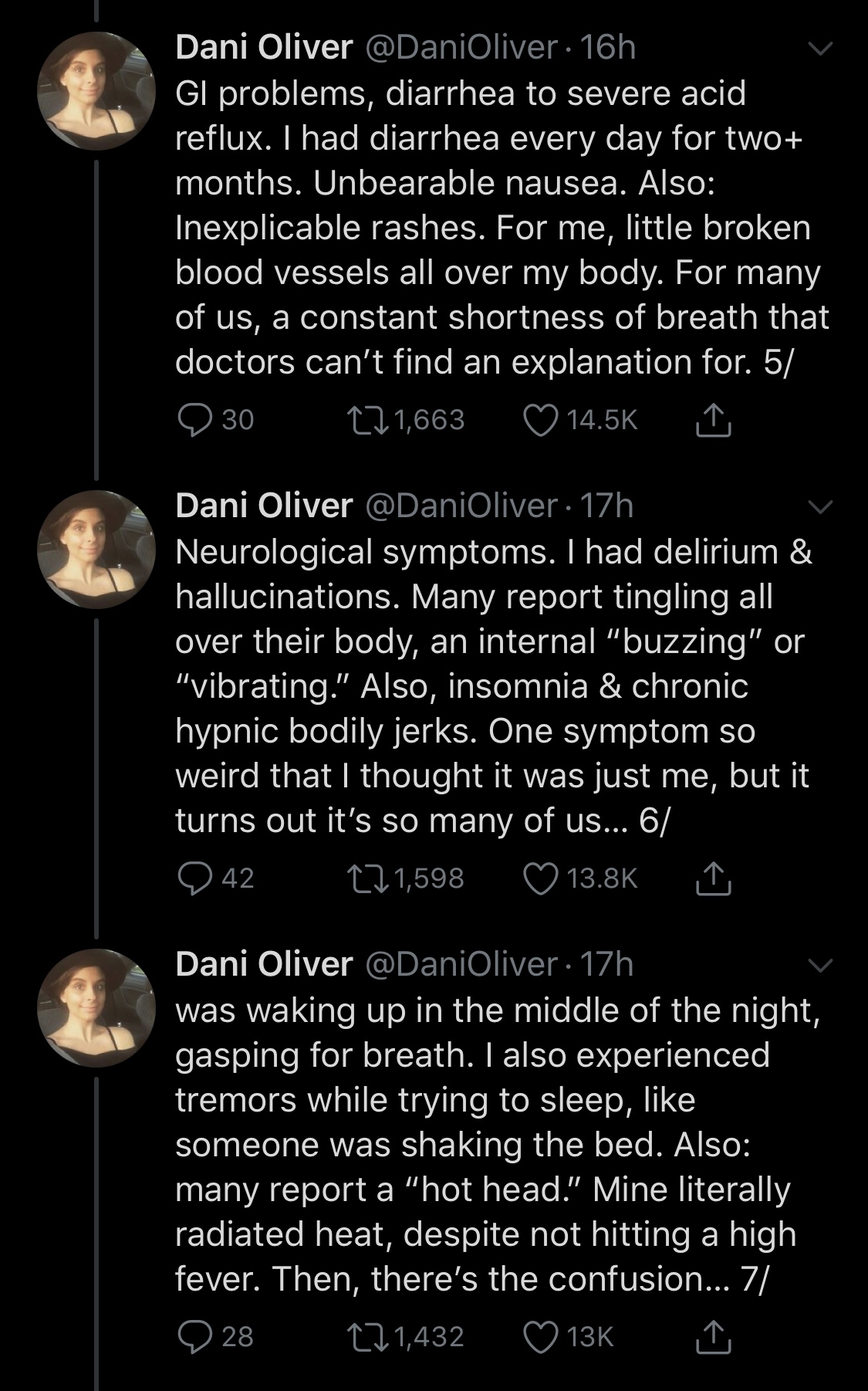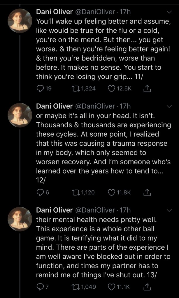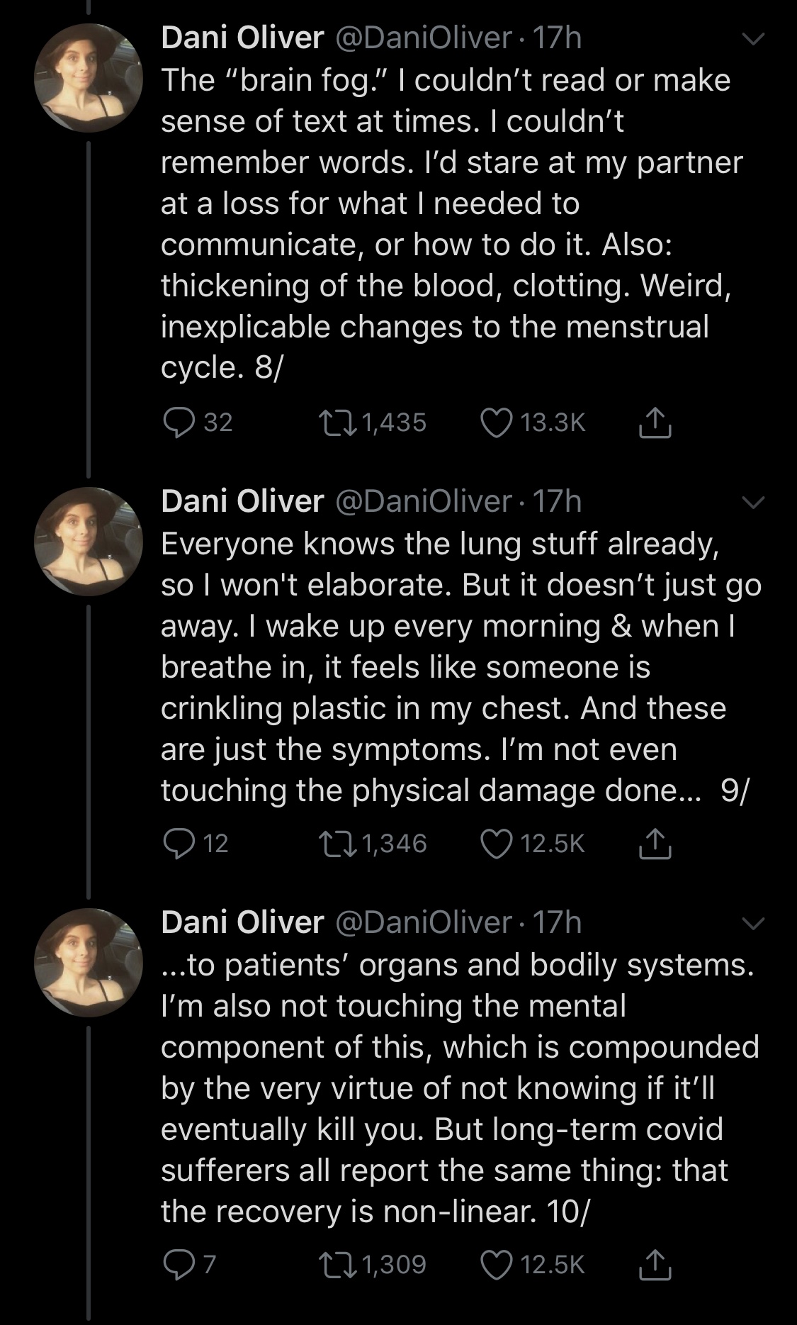 Read this young woman’s thread on Covid. I have most the symptoms she described. Some of the symptoms I forgot about bc I was in such pain, focused on every breath and had Covid dog brain. How she describes everything is so accurate. I had: