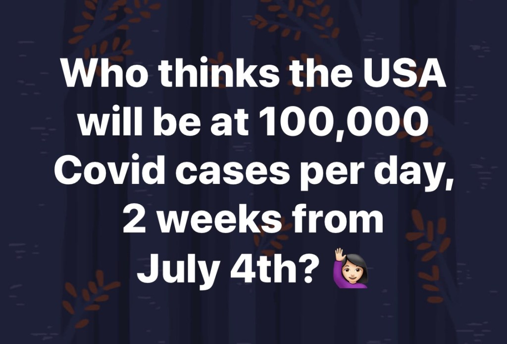 - “Younger people are making up a growing percentage of new coronavirus cases in cities and states where the virus is now surging, a trend that has alarmed public health officials and prompted renewed pleas for masks and social distancing.” (New York Times, June 25, 2020)